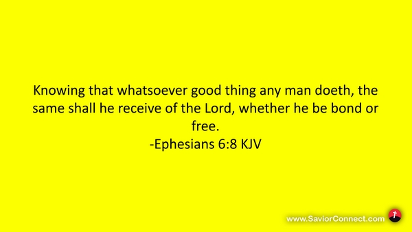 Knowing that whatsoever good thing any man doeth, the same shall he receive of the Lord, whether he be bond or free. -Ephesians 6:8 KJV