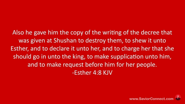 Also he gave him the copy of the writing of the decree that was given at Shushan to destroy them, to shew it unto Esther, and to declare it unto her, and to charge her that she should go in unto the king, to make supplication unto him, and to make request before him for her people. -Esther 4:8 KJV