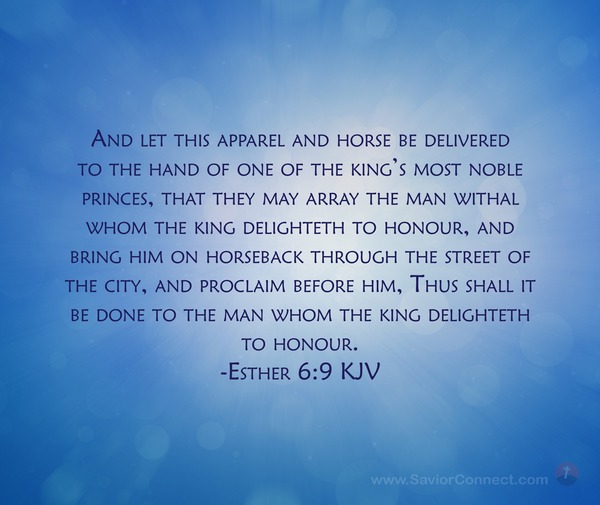 And let this apparel and horse be delivered to the hand of one of the king's most noble princes, that they may array the man withal whom the king delighteth to honour, and bring him on horseback through the street of the city, and proclaim before him, Thus shall it be done to the man whom the king delighteth to honour. -Esther 6:9 KJV