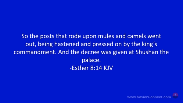 So the posts that rode upon mules and camels went out, being hastened and pressed on by the king's commandment. And the decree was given at Shushan the palace. -Esther 8:14 KJV