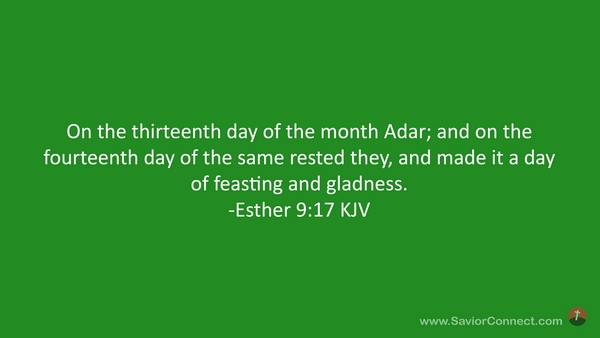 On the thirteenth day of the month Adar; and on the fourteenth day of the same rested they, and made it a day of feasting and gladness. -Esther 9:17 KJV