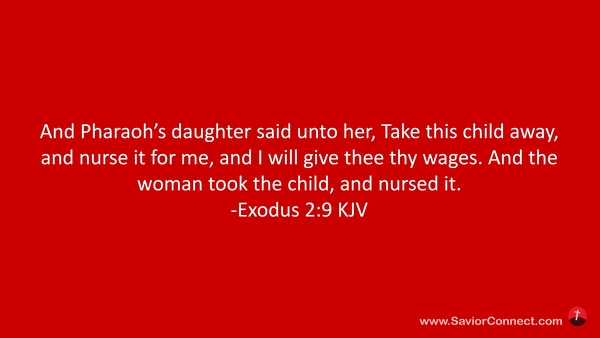 And Pharaoh's daughter said unto her, Take this child away, and nurse it for me, and I will give thee thy wages. And the woman took the child, and nursed it. -Exodus 2:9 KJV