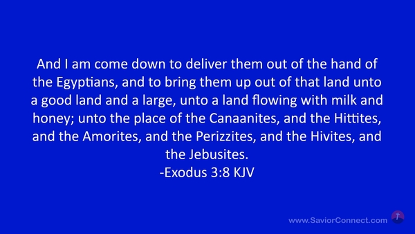 And I am come down to deliver them out of the hand of the Egyptians, and to bring them up out of that land unto a good land and a large, unto a land flowing with milk and honey; unto the place of the Canaanites, and the Hittites, and the Amorites, and the Perizzites, and the Hivites, and the Jebusites. -Exodus 3:8 KJV