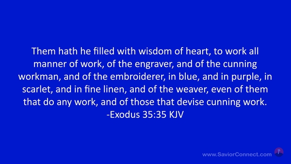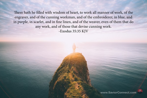 Them hath he filled with wisdom of heart, to work all manner of work, of the engraver, and of the cunning workman, and of the embroiderer, in blue, and in purple, in scarlet, and in fine linen, and of the weaver, even of them that do any work, and of those that devise cunning work. -Exodus 35:35 KJV