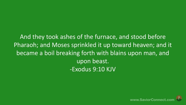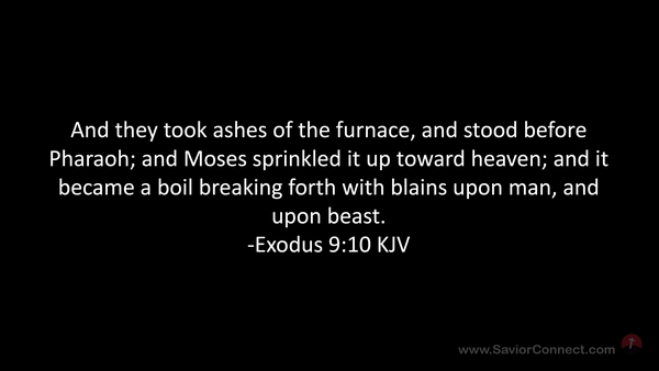 And they took ashes of the furnace, and stood before Pharaoh; and Moses sprinkled it up toward heaven; and it became a boil breaking forth with blains upon man, and upon beast. -Exodus 9:10 KJV