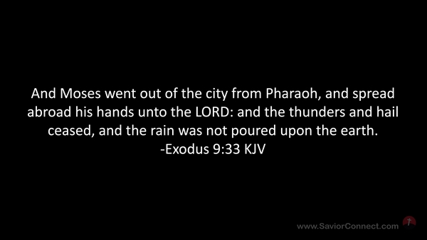 And Moses went out of the city from Pharaoh, and spread abroad his hands unto the LORD: and the thunders and hail ceased, and the rain was not poured upon the earth. -Exodus 9:33 KJV