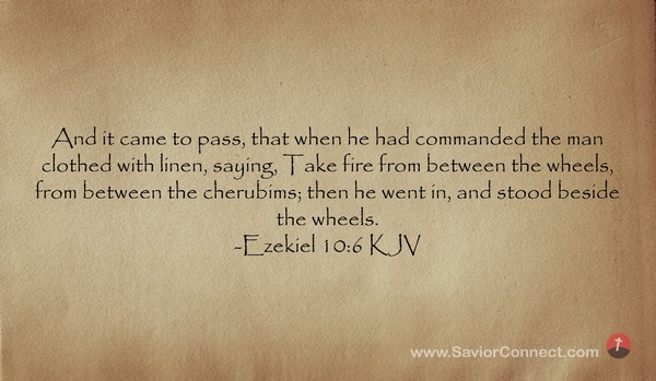 And it came to pass, that when he had commanded the man clothed with linen, saying, Take fire from between the wheels, from between the cherubims; then he went in, and stood beside the wheels. -Ezekiel 10:6 KJV
