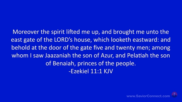 Moreover the spirit lifted me up, and brought me unto the east gate of the LORD's house, which looketh eastward: and behold at the door of the gate five and twenty men; among whom I saw Jaazaniah the son of Azur, and Pelatiah the son of Benaiah, princes of the people. -Ezekiel 11:1 KJV