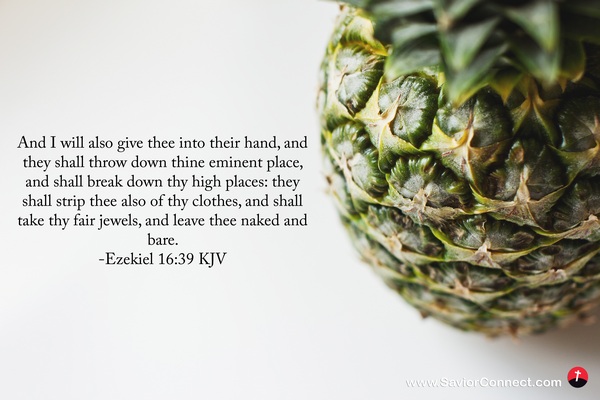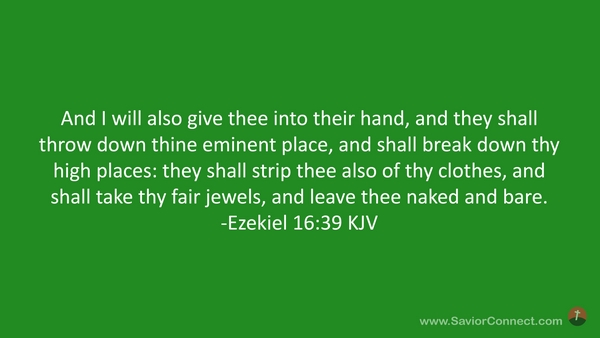 And I will also give thee into their hand, and they shall throw down thine eminent place, and shall break down thy high places: they shall strip thee also of thy clothes, and shall take thy fair jewels, and leave thee naked and bare. -Ezekiel 16:39 KJV