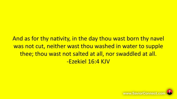And as for thy nativity, in the day thou wast born thy navel was not cut, neither wast thou washed in water to supple thee; thou wast not salted at all, nor swaddled at all. -Ezekiel 16:4 KJV
