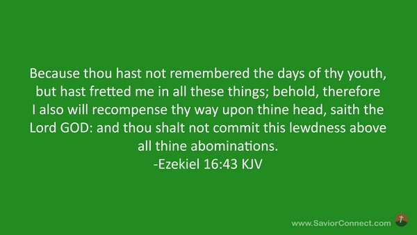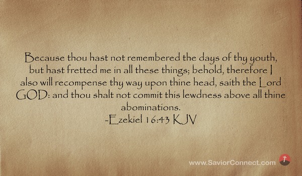 Because thou hast not remembered the days of thy youth, but hast fretted me in all these things; behold, therefore I also will recompense thy way upon thine head, saith the Lord GOD: and thou shalt not commit this lewdness above all thine abominations. -Ezekiel 16:43 KJV