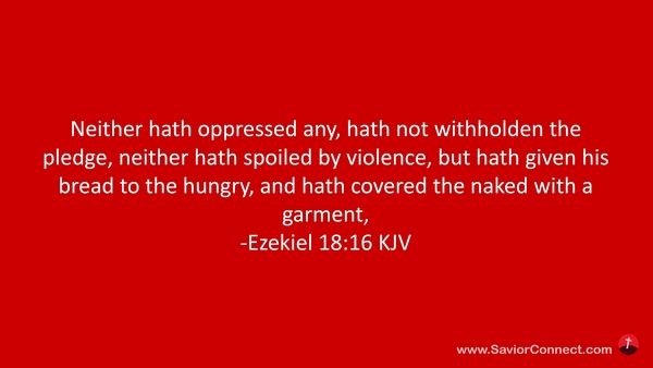 Neither hath oppressed any, hath not withholden the pledge, neither hath spoiled by violence, but hath given his bread to the hungry, and hath covered the naked with a garment, -Ezekiel 18:16 KJV