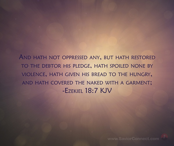 And hath not oppressed any, but hath restored to the debtor his pledge, hath spoiled none by violence, hath given his bread to the hungry, and hath covered the naked with a garment; -Ezekiel 18:7 KJV