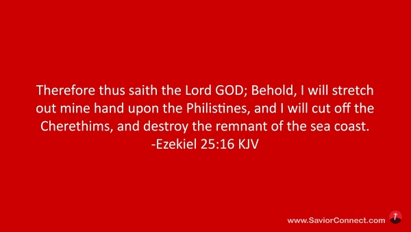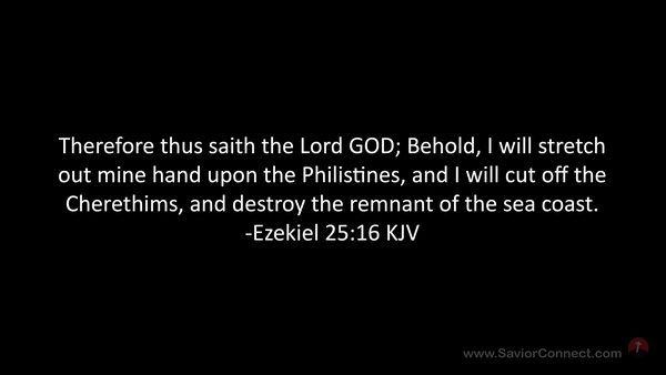 Therefore thus saith the Lord GOD; Behold, I will stretch out mine hand upon the Philistines, and I will cut off the Cherethims, and destroy the remnant of the sea coast. -Ezekiel 25:16 KJV