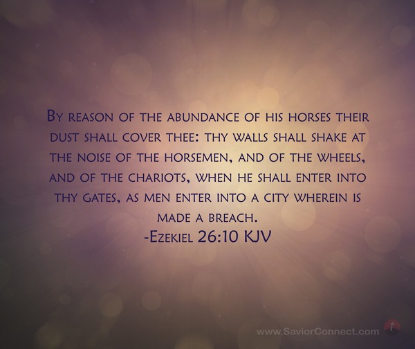 By reason of the abundance of his horses their dust shall cover thee: thy walls shall shake at the noise of the horsemen, and of the wheels, and of the chariots, when he shall enter into thy gates, as men enter into a city wherein is made a breach. -Ezekiel 26:10 KJV