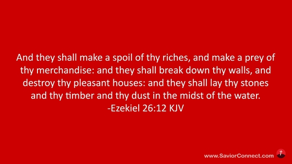 And they shall make a spoil of thy riches, and make a prey of thy merchandise: and they shall break down thy walls, and destroy thy pleasant houses: and they shall lay thy stones and thy timber and thy dust in the midst of the water. -Ezekiel 26:12 KJV