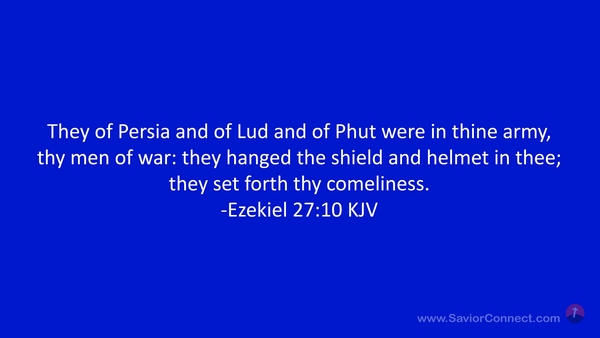 They of Persia and of Lud and of Phut were in thine army, thy men of war: they hanged the shield and helmet in thee; they set forth thy comeliness. -Ezekiel 27:10 KJV