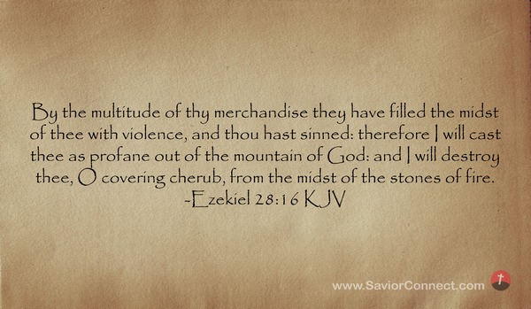 By the multitude of thy merchandise they have filled the midst of thee with violence, and thou hast sinned: therefore I will cast thee as profane out of the mountain of God: and I will destroy thee, O covering cherub, from the midst of the stones of fire. -Ezekiel 28:16 KJV