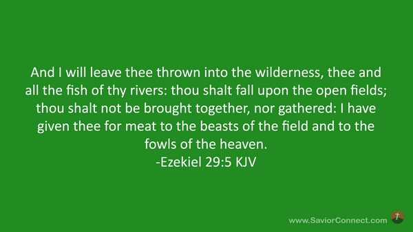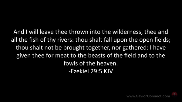 And I will leave thee thrown into the wilderness, thee and all the fish of thy rivers: thou shalt fall upon the open fields; thou shalt not be brought together, nor gathered: I have given thee for meat to the beasts of the field and to the fowls of the heaven. -Ezekiel 29:5 KJV
