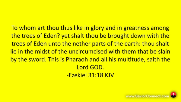 To whom art thou thus like in glory and in greatness among the trees of Eden? yet shalt thou be brought down with the trees of Eden unto the nether parts of the earth: thou shalt lie in the midst of the uncircumcised with them that be slain by the sword. This is Pharaoh and all his multitude, saith the Lord GOD. -Ezekiel 31:18 KJV