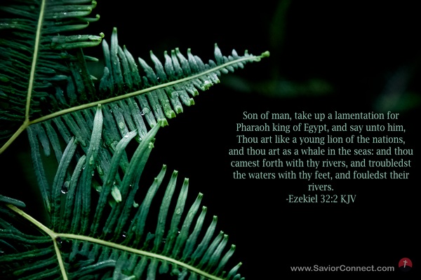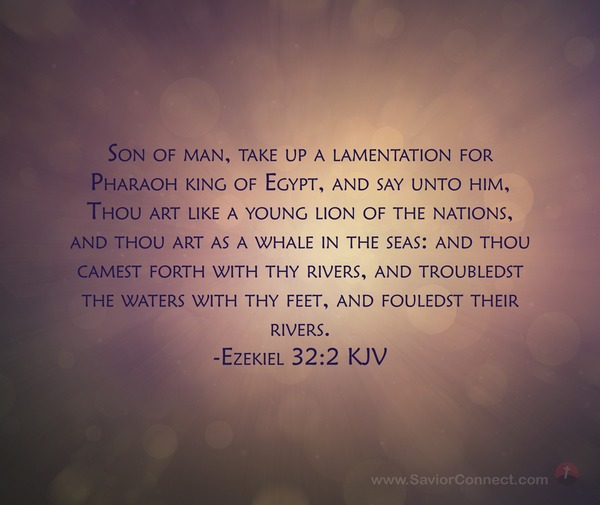 Son of man, take up a lamentation for Pharaoh king of Egypt, and say unto him, Thou art like a young lion of the nations, and thou art as a whale in the seas: and thou camest forth with thy rivers, and troubledst the waters with thy feet, and fouledst their rivers. -Ezekiel 32:2 KJV