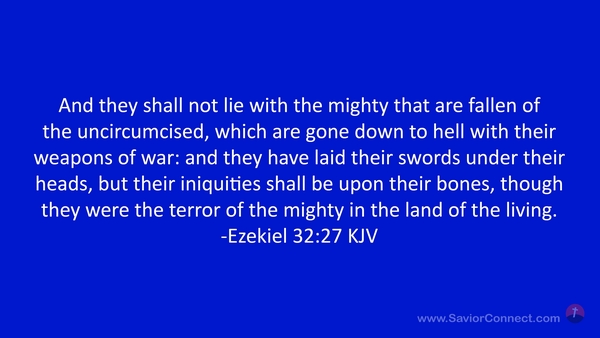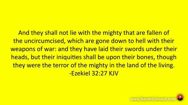 And they shall not lie with the mighty that are fallen of the uncircumcised, which are gone down to hell with their weapons of war: and they have laid their swords under their heads, but their iniquities shall be upon their bones, though they were the terror of the mighty in the land of the living. -Ezekiel 32:27 KJV