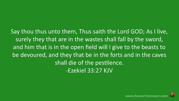 Say thou thus unto them, Thus saith the Lord GOD; As I live, surely they that are in the wastes shall fall by the sword, and him that is in the open field will I give to the beasts to be devoured, and they that be in the forts and in the caves shall die of the pestilence. -Ezekiel 33:27 KJV