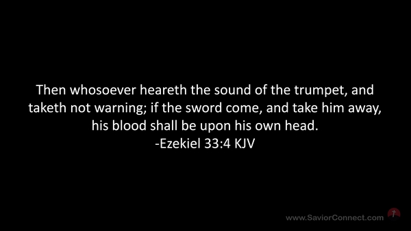 Then whosoever heareth the sound of the trumpet, and taketh not warning; if the sword come, and take him away, his blood shall be upon his own head. -Ezekiel 33:4 KJV
