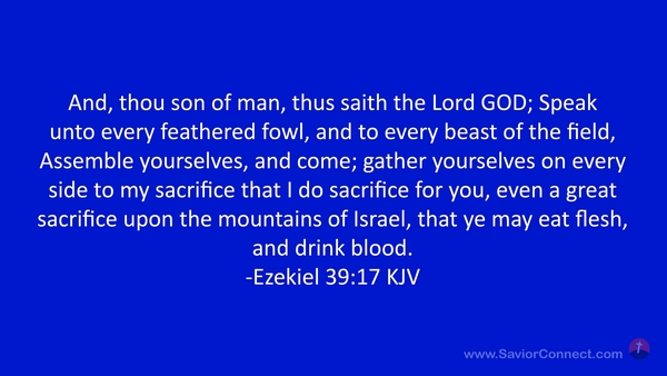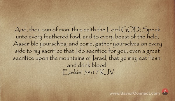 And, thou son of man, thus saith the Lord GOD; Speak unto every feathered fowl, and to every beast of the field, Assemble yourselves, and come; gather yourselves on every side to my sacrifice that I do sacrifice for you, even a great sacrifice upon the mountains of Israel, that ye may eat flesh, and drink blood. -Ezekiel 39:17 KJV