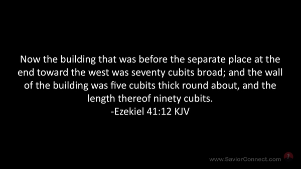 Now the building that was before the separate place at the end toward the west was seventy cubits broad; and the wall of the building was five cubits thick round about, and the length thereof ninety cubits. -Ezekiel 41:12 KJV