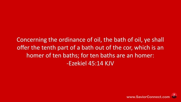 Concerning the ordinance of oil, the bath of oil, ye shall offer the tenth part of a bath out of the cor, which is an homer of ten baths; for ten baths are an homer: -Ezekiel 45:14 KJV