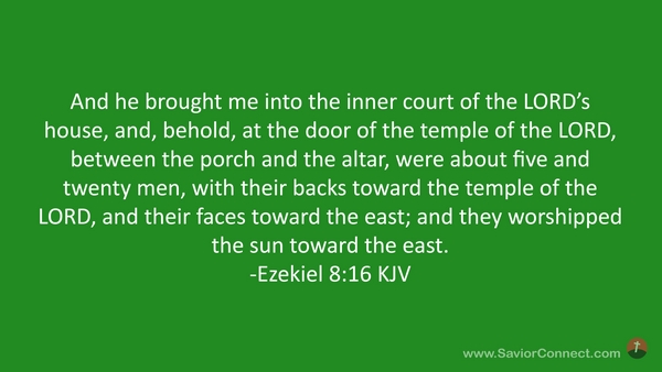 And he brought me into the inner court of the LORD's house, and, behold, at the door of the temple of the LORD, between the porch and the altar, were about five and twenty men, with their backs toward the temple of the LORD, and their faces toward the east; and they worshipped the sun toward the east. -Ezekiel 8:16 KJV