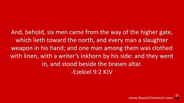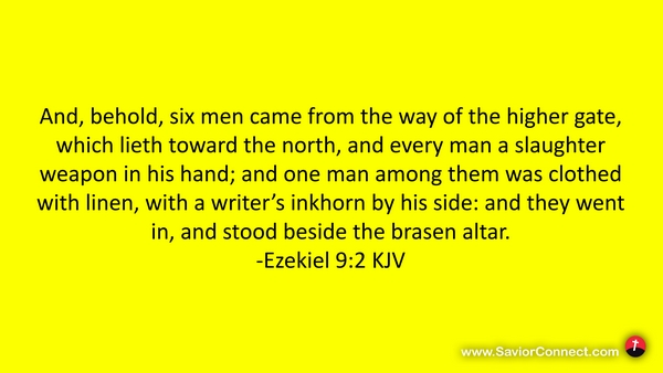 And, behold, six men came from the way of the higher gate, which lieth toward the north, and every man a slaughter weapon in his hand; and one man among them was clothed with linen, with a writer's inkhorn by his side: and they went in, and stood beside the brasen altar. -Ezekiel 9:2 KJV