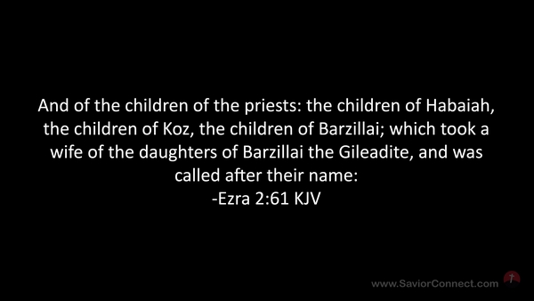 And of the children of the priests: the children of Habaiah, the children of Koz, the children of Barzillai; which took a wife of the daughters of Barzillai the Gileadite, and was called after their name: -Ezra 2:61 KJV