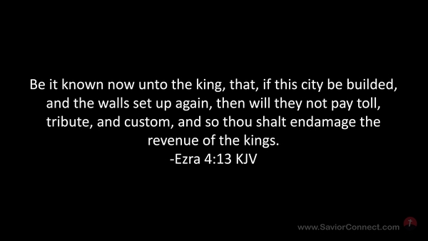 Be it known now unto the king, that, if this city be builded, and the walls set up again, then will they not pay toll, tribute, and custom, and so thou shalt endamage the revenue of the kings. -Ezra 4:13 KJV