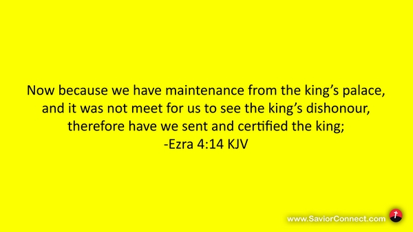 Now because we have maintenance from the king's palace, and it was not meet for us to see the king's dishonour, therefore have we sent and certified the king; -Ezra 4:14 KJV