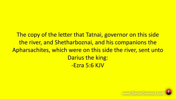 The copy of the letter that Tatnai, governor on this side the river, and Shetharboznai, and his companions the Apharsachites, which were on this side the river, sent unto Darius the king: -Ezra 5:6 KJV