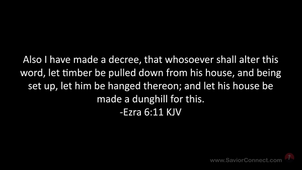 Also I have made a decree, that whosoever shall alter this word, let timber be pulled down from his house, and being set up, let him be hanged thereon; and let his house be made a dunghill for this. -Ezra 6:11 KJV