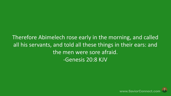 Therefore Abimelech rose early in the morning, and called all his servants, and told all these things in their ears: and the men were sore afraid. -Genesis 20:8 KJV