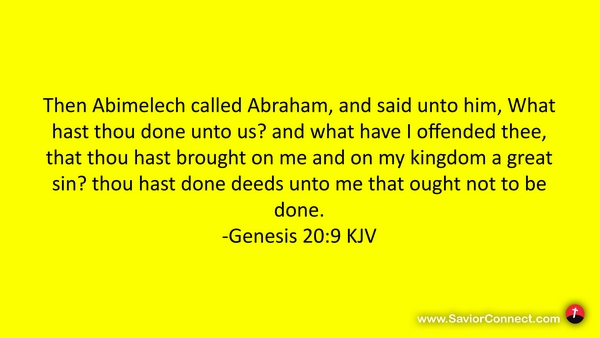 Then Abimelech called Abraham, and said unto him, What hast thou done unto us? and what have I offended thee, that thou hast brought on me and on my kingdom a great sin? thou hast done deeds unto me that ought not to be done. -Genesis 20:9 KJV