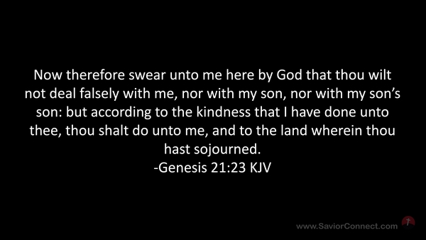 Now therefore swear unto me here by God that thou wilt not deal falsely with me, nor with my son, nor with my son's son: but according to the kindness that I have done unto thee, thou shalt do unto me, and to the land wherein thou hast sojourned. -Genesis 21:23 KJV