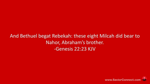 And Bethuel begat Rebekah: these eight Milcah did bear to Nahor, Abraham's brother. -Genesis 22:23 KJV