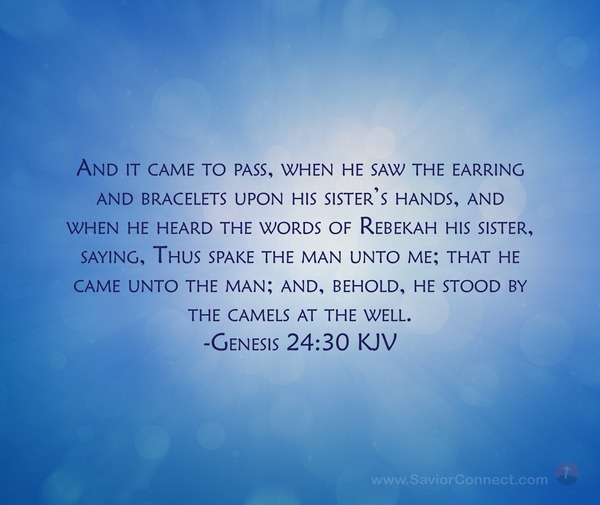 And it came to pass, when he saw the earring and bracelets upon his sister's hands, and when he heard the words of Rebekah his sister, saying, Thus spake the man unto me; that he came unto the man; and, behold, he stood by the camels at the well. -Genesis 24:30 KJV