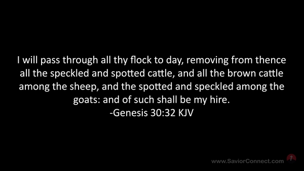 I will pass through all thy flock to day, removing from thence all the speckled and spotted cattle, and all the brown cattle among the sheep, and the spotted and speckled among the goats: and of such shall be my hire. -Genesis 30:32 KJV