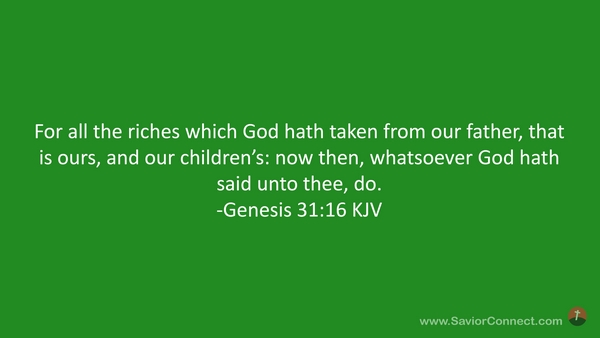 For all the riches which God hath taken from our father, that is ours, and our children's: now then, whatsoever God hath said unto thee, do. -Genesis 31:16 KJV