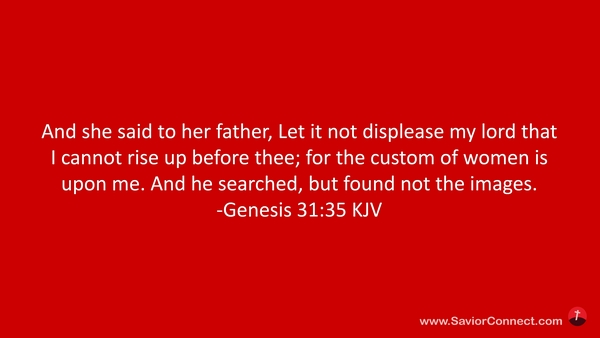 And she said to her father, Let it not displease my lord that I cannot rise up before thee; for the custom of women is upon me. And he searched, but found not the images. -Genesis 31:35 KJV