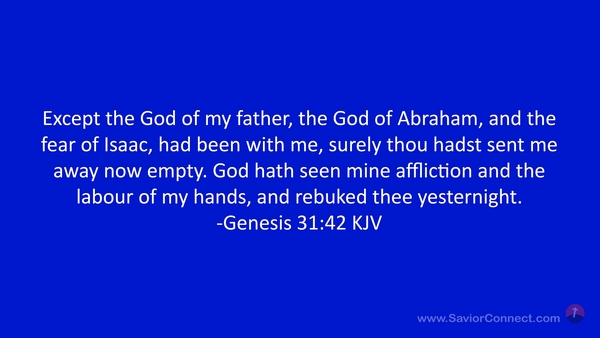 Except the God of my father, the God of Abraham, and the fear of Isaac, had been with me, surely thou hadst sent me away now empty. God hath seen mine affliction and the labour of my hands, and rebuked thee yesternight. -Genesis 31:42 KJV