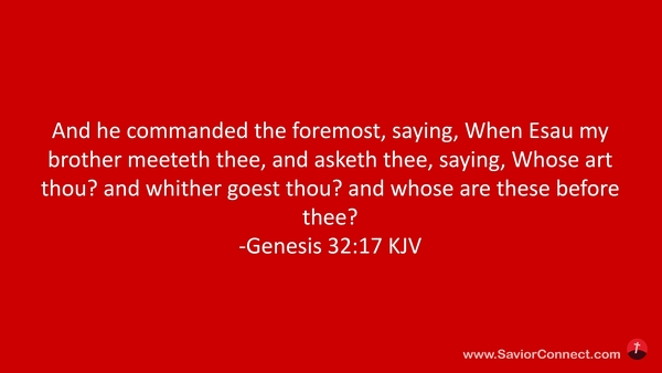 And he commanded the foremost, saying, When Esau my brother meeteth thee, and asketh thee, saying, Whose art thou? and whither goest thou? and whose are these before thee? -Genesis 32:17 KJV