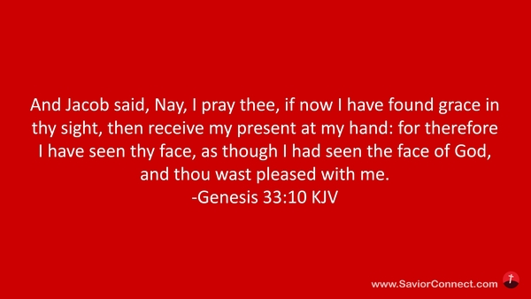 And Jacob said, Nay, I pray thee, if now I have found grace in thy sight, then receive my present at my hand: for therefore I have seen thy face, as though I had seen the face of God, and thou wast pleased with me. -Genesis 33:10 KJV