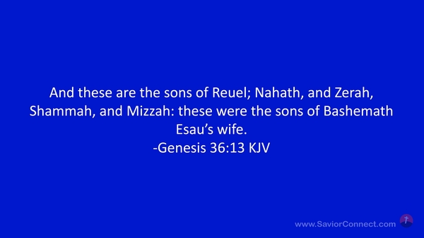 And these are the sons of Reuel; Nahath, and Zerah, Shammah, and Mizzah: these were the sons of Bashemath Esau's wife. -Genesis 36:13 KJV